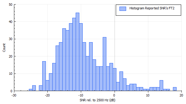 The histogram values suggest that fading affects the accuracy of the SNR algorithm. One could even argue that FT2 can make use of short signal peaks, but that comes at the expense of lost cycles. Nevertheless, Rob PE1ITR mentioned that FT2 might be advantageous for example on VHF/UHF where short-lived aircraft reflections can occur. Rapid TR cycles could be beneficial in such a case.
