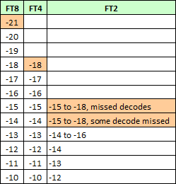 There are way too many values below -11 and that goes against the theory. In order to verify the SNR’s, a test was done to evaluate decoding, comparing with FT8 and FT4.