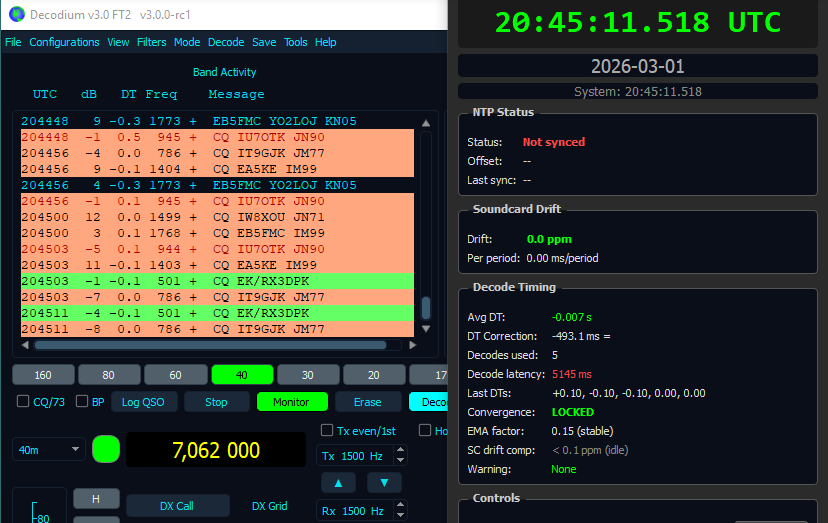 It is obvious that the stringent time requirements for FT2 had to be addressed to have it work at all. Decodium tunes the application time to the DT’s of the decodes and slowly adjusts the application clock.