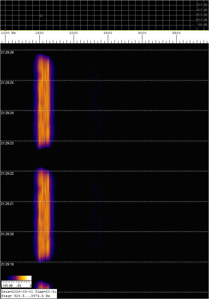 With Spectrum Lab, I recorded a few transmissions whilst switching between even and odd, to time the length of transmissions during even and odd cycles, which compares to subsequent TX/RX cycles. The waterfall graph with second markers shows the transmission duration to be a bit over 3 seconds and gaps are approximately 600 ms.